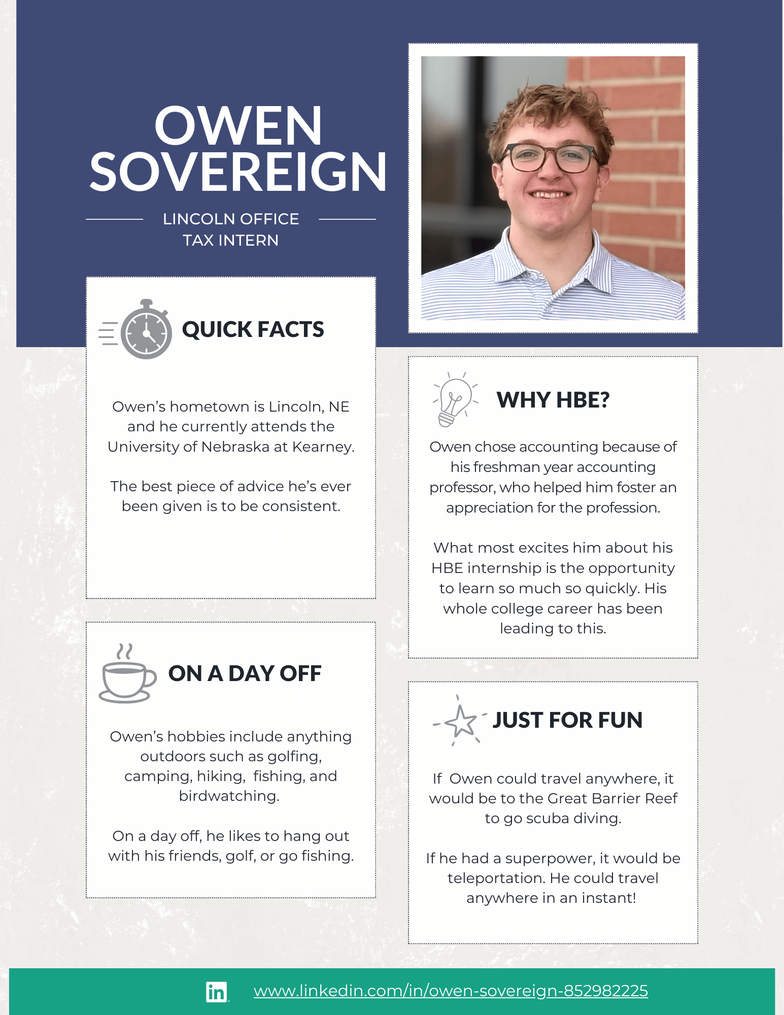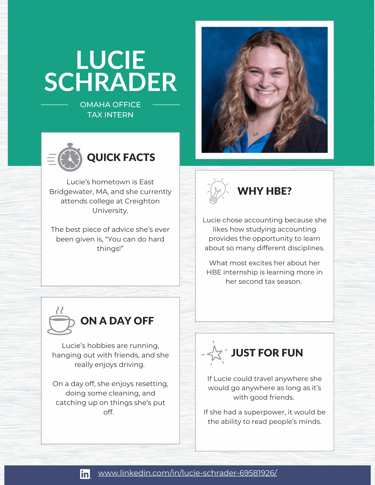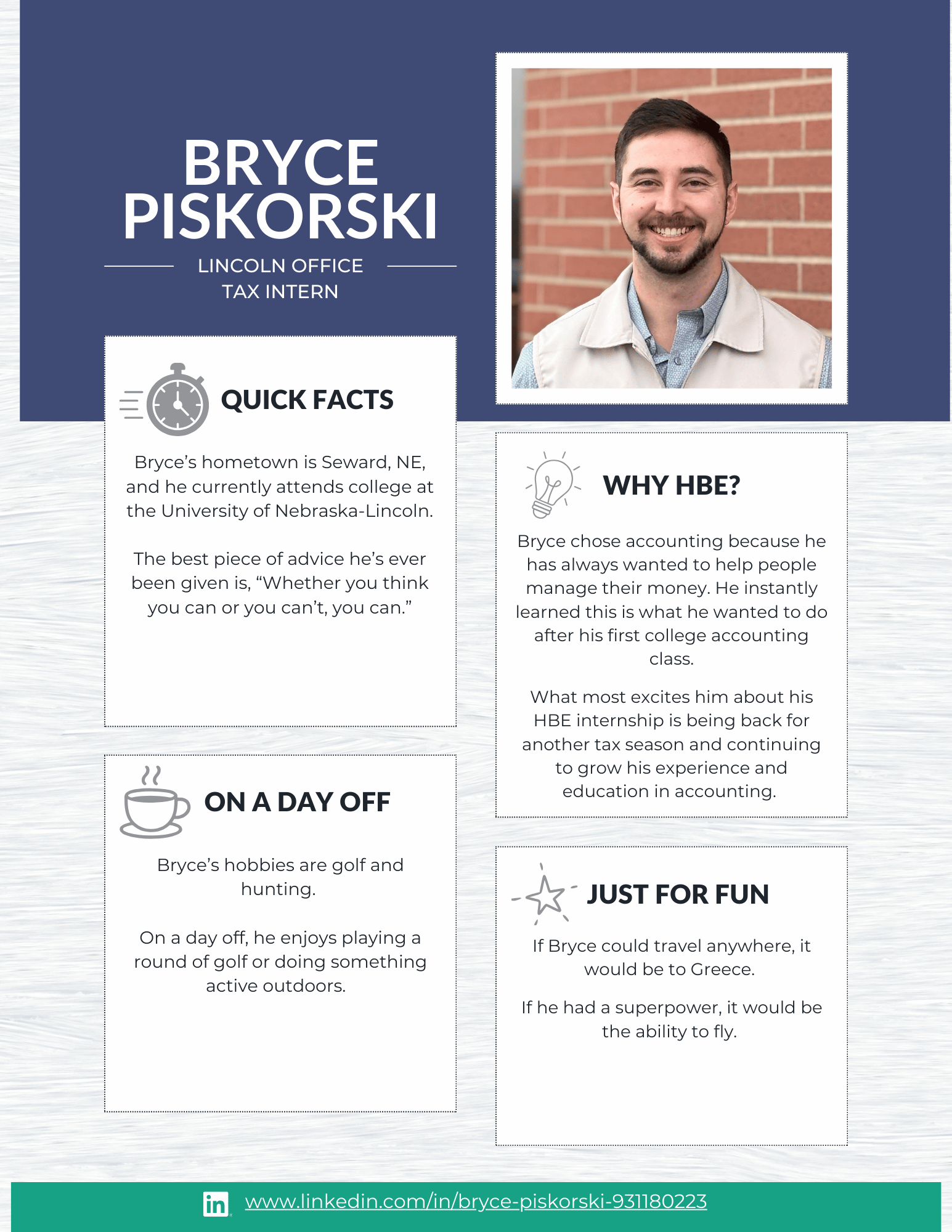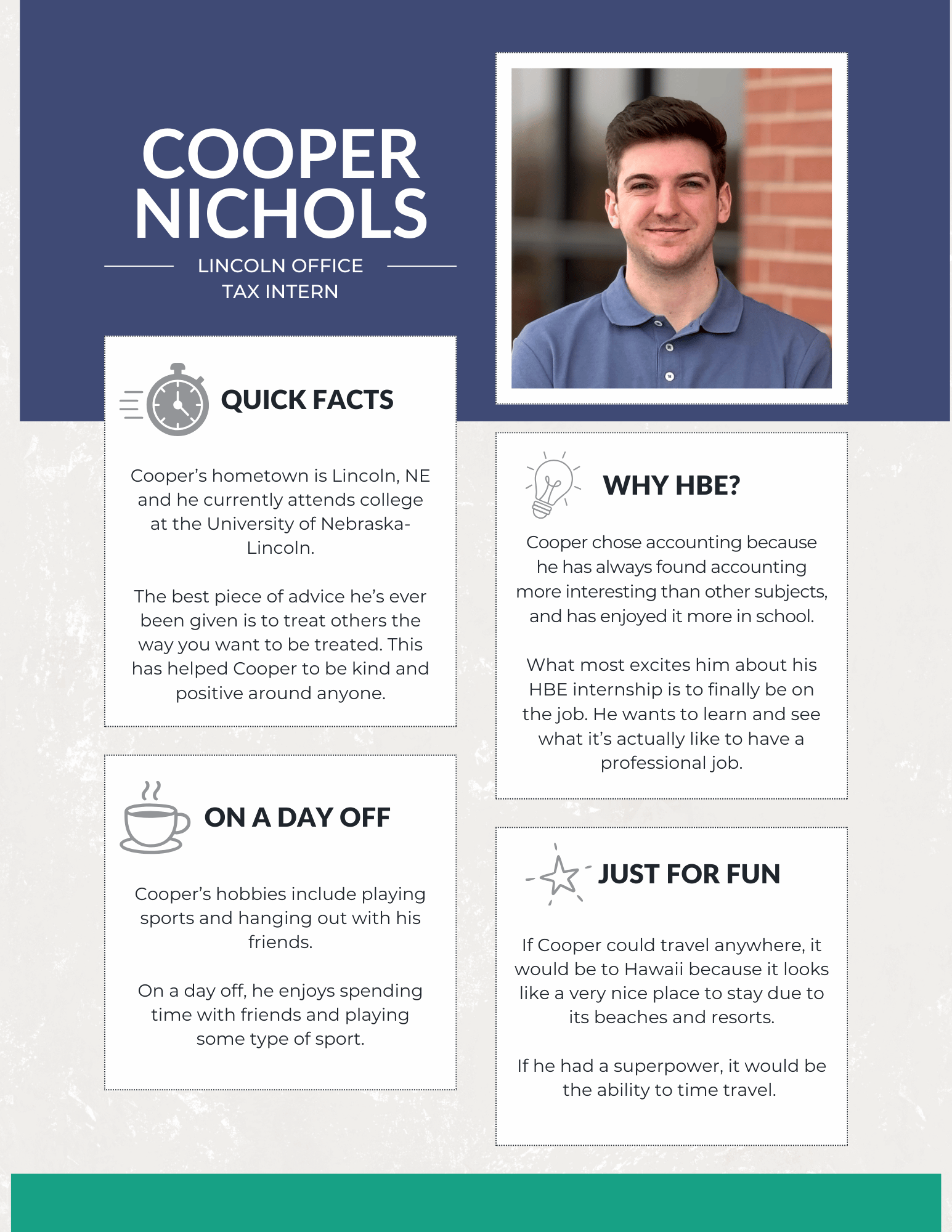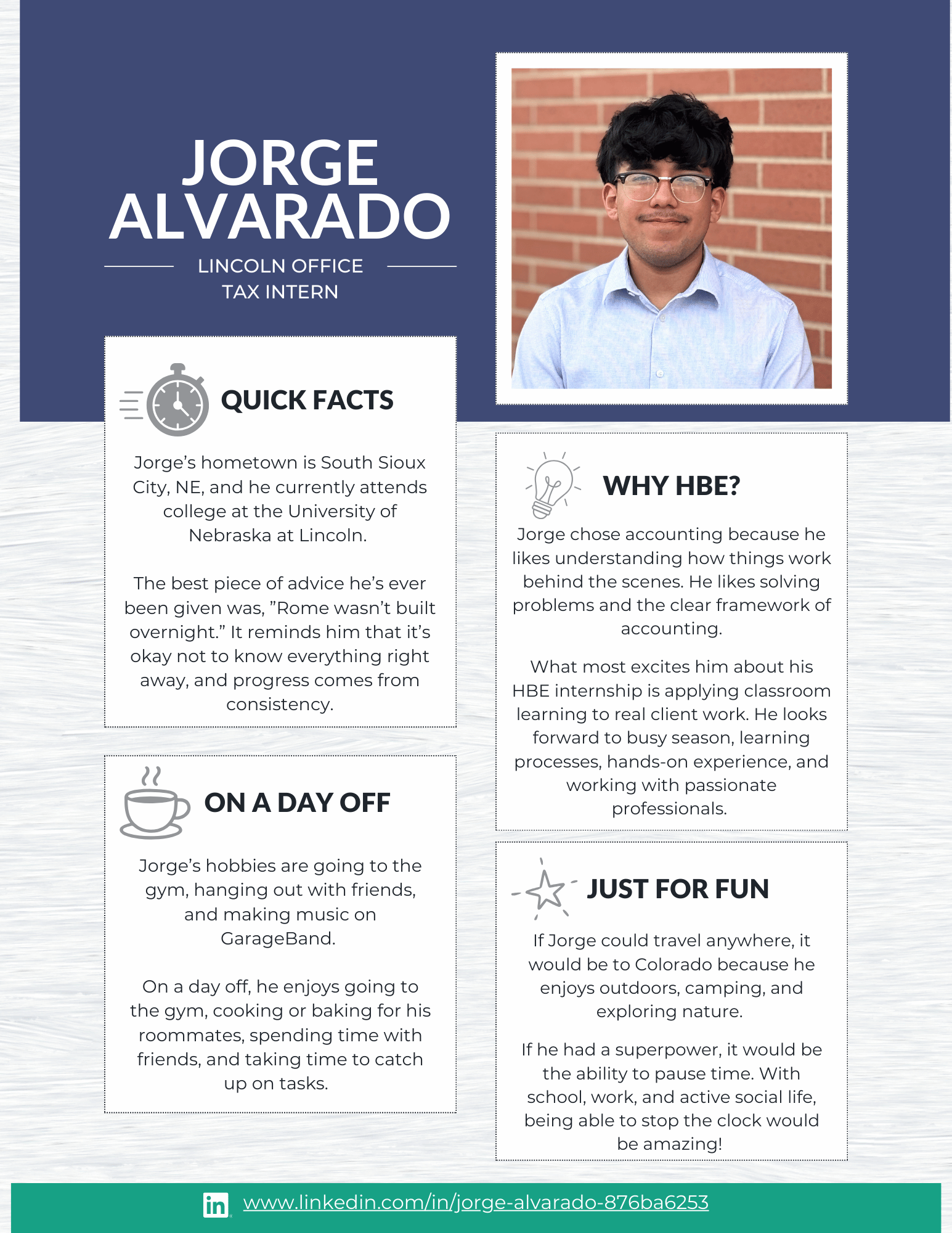 At HBE, our internship program is designed to give students meaningful, hands-on experience in audit, tax, and administration. From day one, our interns are immersed in real client work and take on many of the same responsibilities as our first-year staff. The result? Real learning, real experience, and a true understanding of what a career in public accounting looks like.
