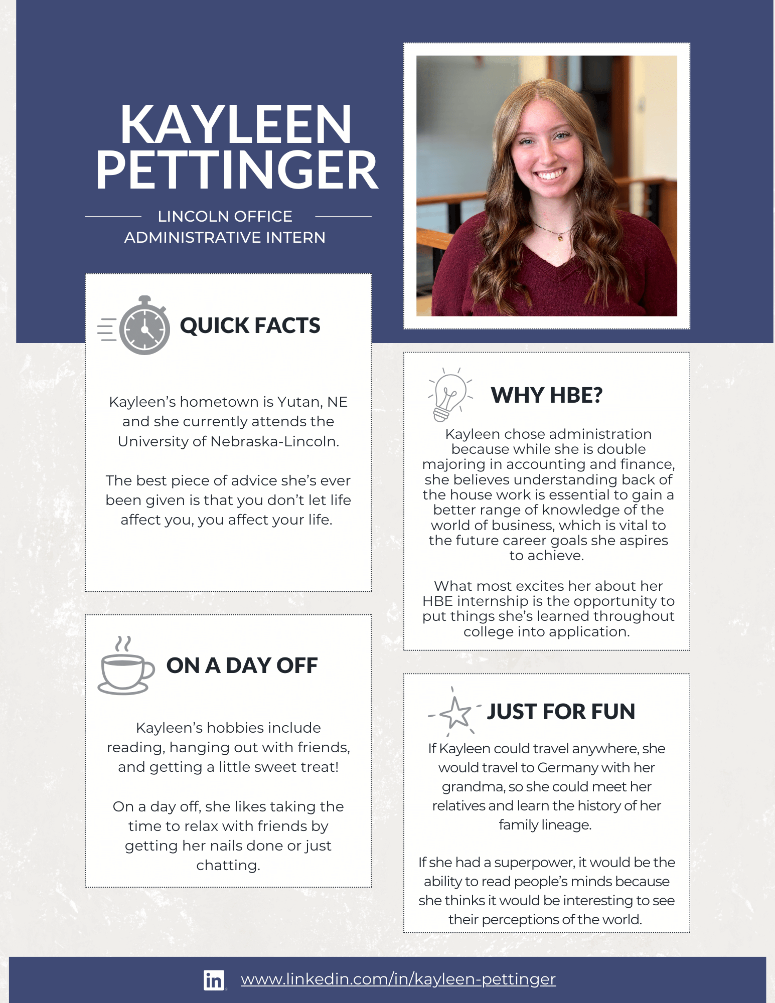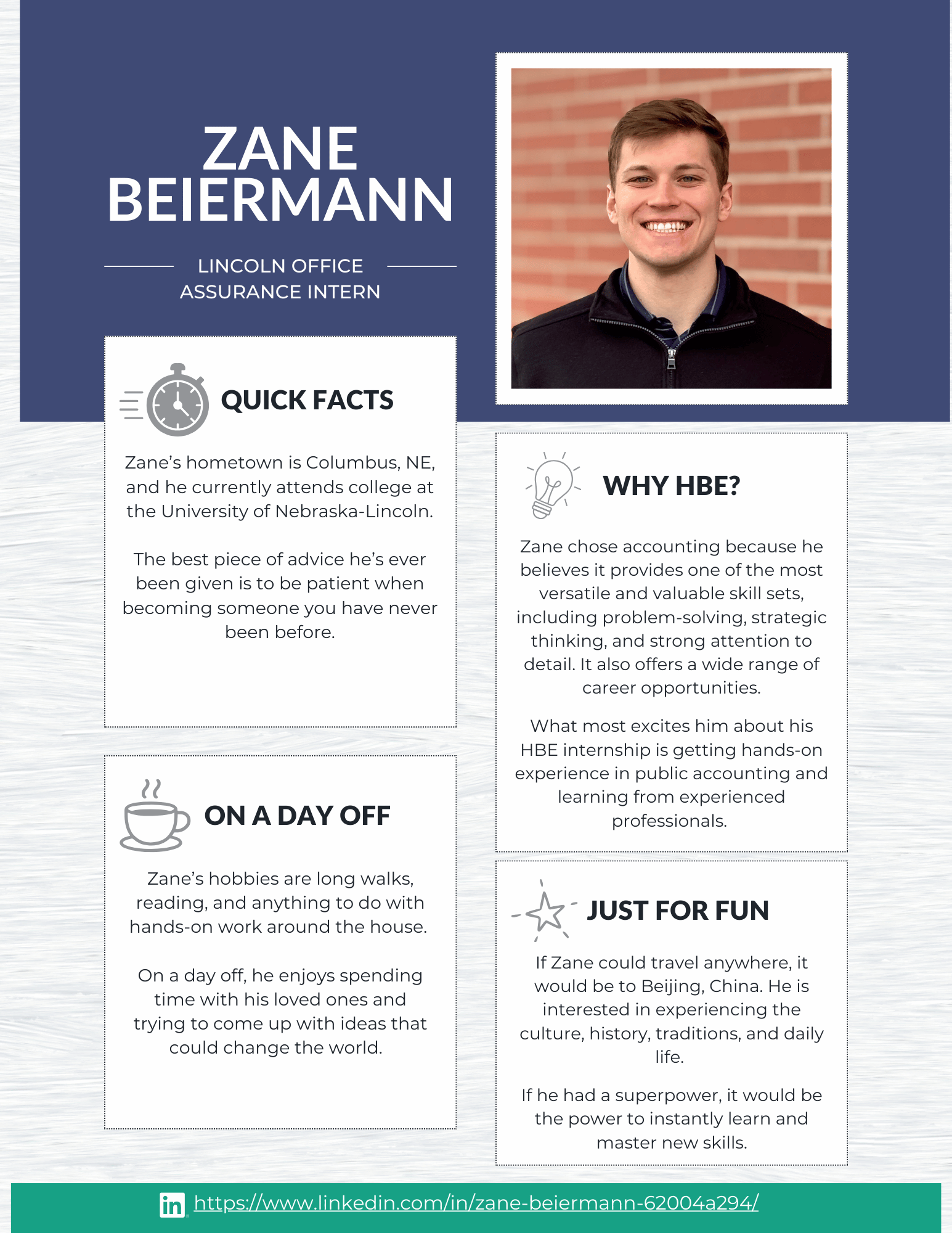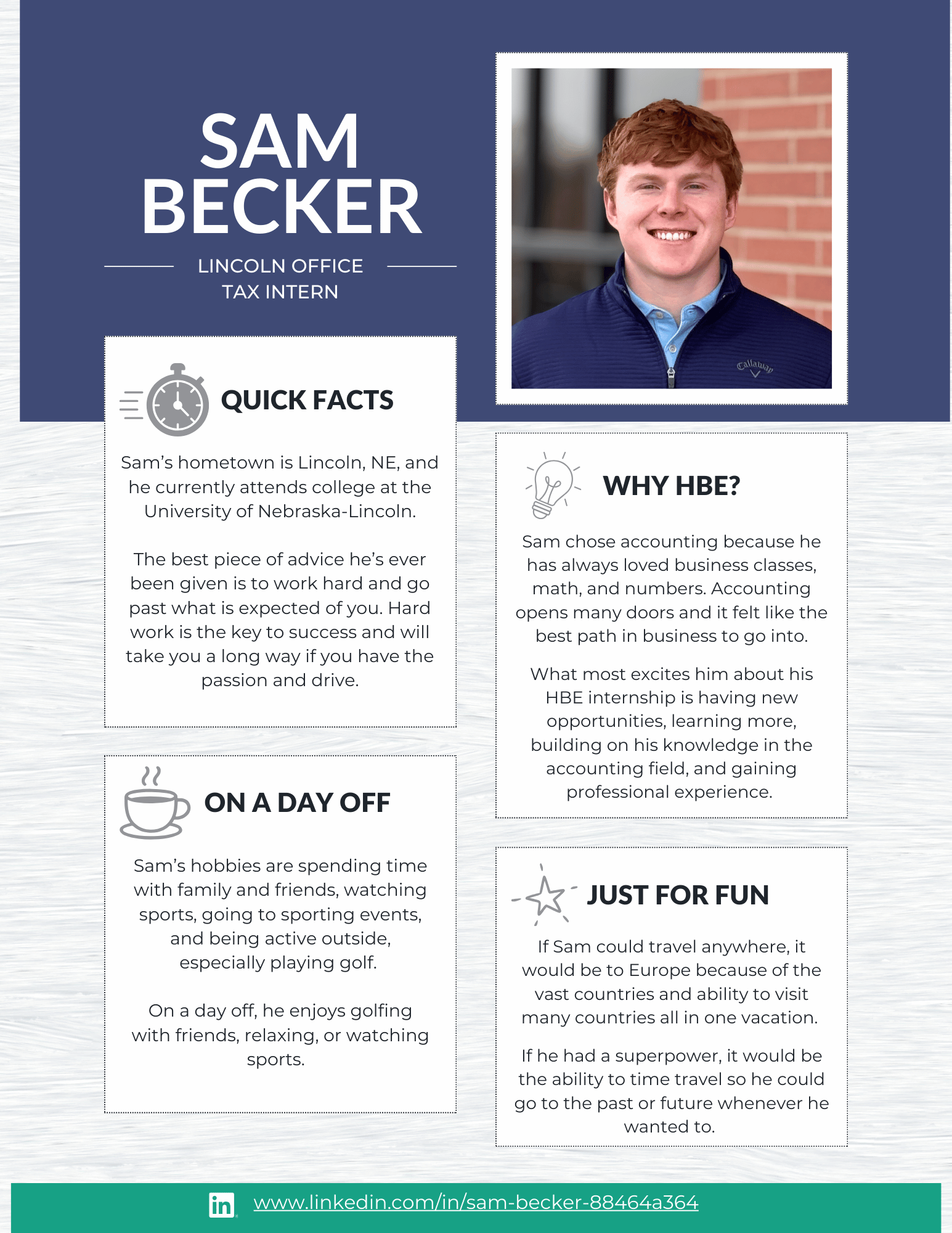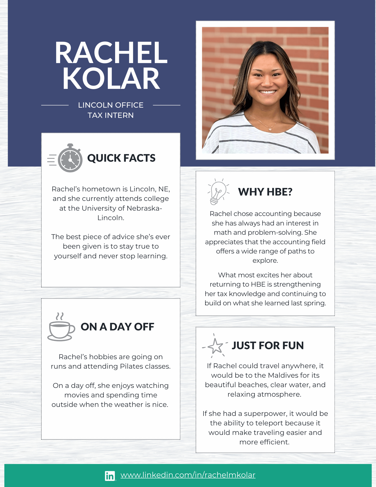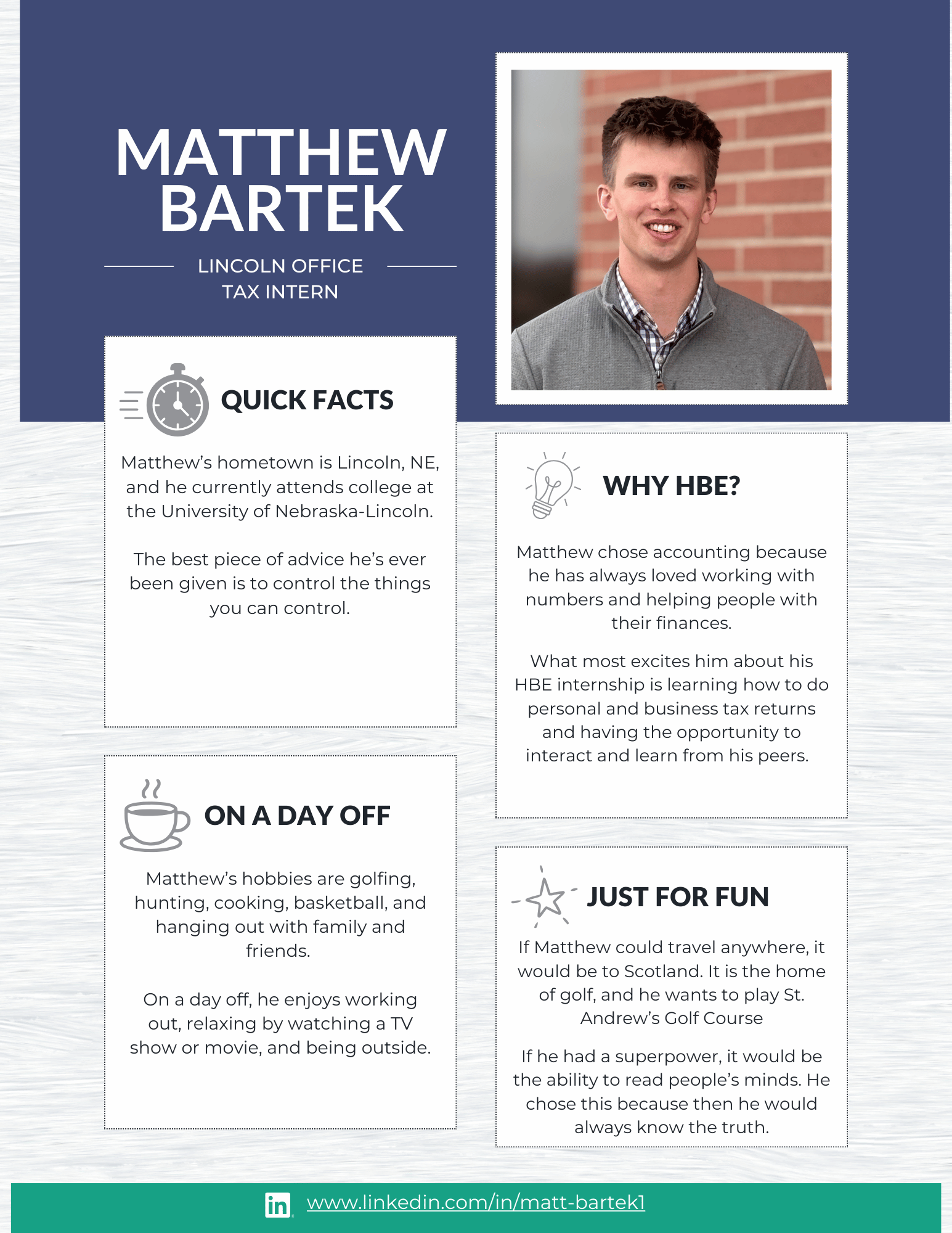 At HBE, our internship program is designed to give students meaningful, hands-on experience in audit, tax, and administration. From day one, our interns are immersed in real client work and take on many of the same responsibilities as our first-year staff. The result? Real learning, real experience, and a true understanding of what a career in public accounting looks like.